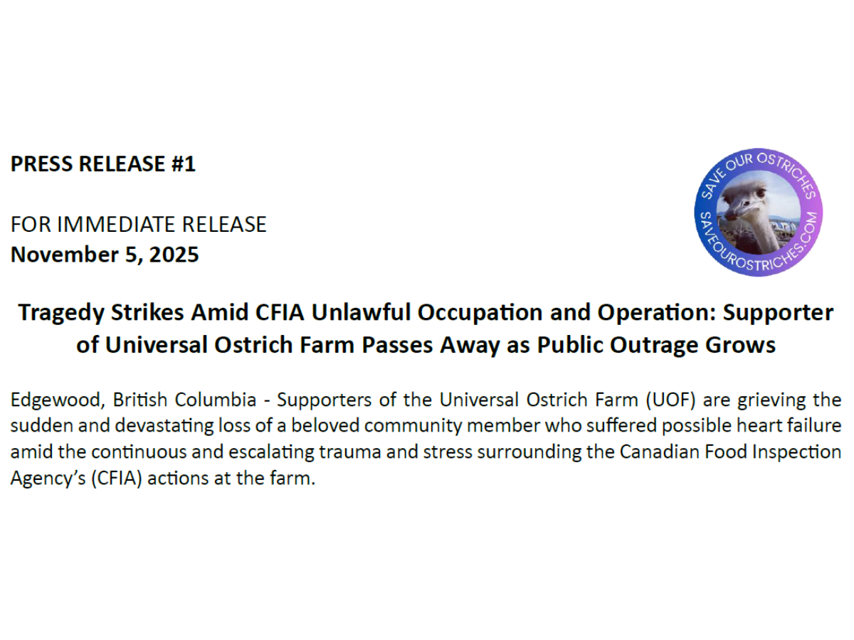 FOR IMMEDIATE RELEASE – November 5, 2025 Tragedy Strikes Amid CFIA Unlawful Occupation and Operation: Supporter of Universal Ostrich Farm Passes Away as Public Outrage Grows Edgewood, British Columbia – Supporters of the Universal Ostrich Farm (UOF) are grieving the sudden and devastating loss of a beloved community member who suffered possible heart failure amid...