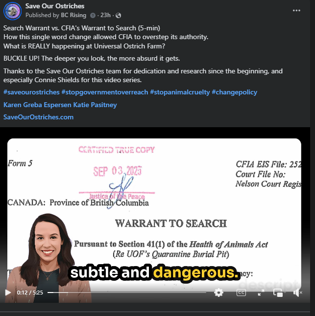 In this video, we break down what a “warrant to search” really means, how it was used against Universal Ostrich Farms, and why the Supreme Court of Canada’s stay order stopped CFIA in its tracks. Because understanding the language of the law is the first step to recognizing when it’s being abused.