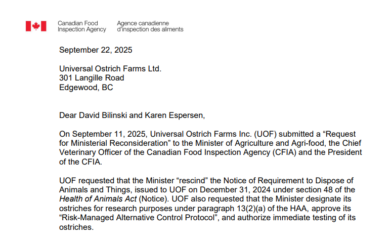 September 22, 2025, 03:31:50 A.M. MST Canadian Food Inspection Agency (CFIA) letter dated September 22, 2025, to David Bilinski and Karen Espersen, co-owners of Universal Ostrich Farms Ltd, in response to the farm’s “Request for Ministerial Reconsideration” to the Minister of Agriculture and Agri-food on September 11, 2025. Even though this is a Ministerial Request...