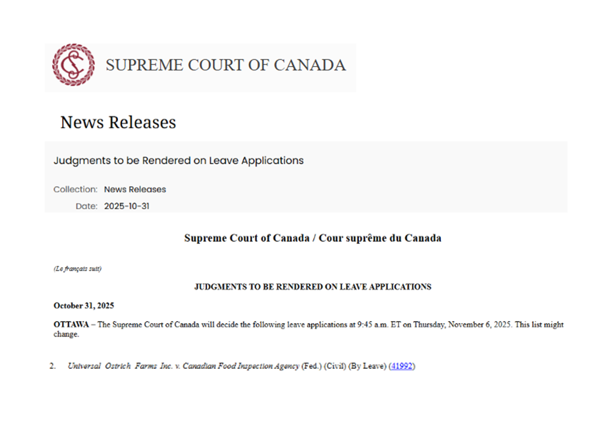 Source: Universal Ostrich Farms Inc. vs. Canadian Food Inspection Agency On November 6, 2025, the Supreme Court of Canada declined UOF’s leave application to be heard at the Supreme Court level, for Universal Ostrich Farms Inc. v. Canadian Food Inspection Agency (41992). During the past ten months of legal process, expert reports and affidavits were prepared for UOF by...
